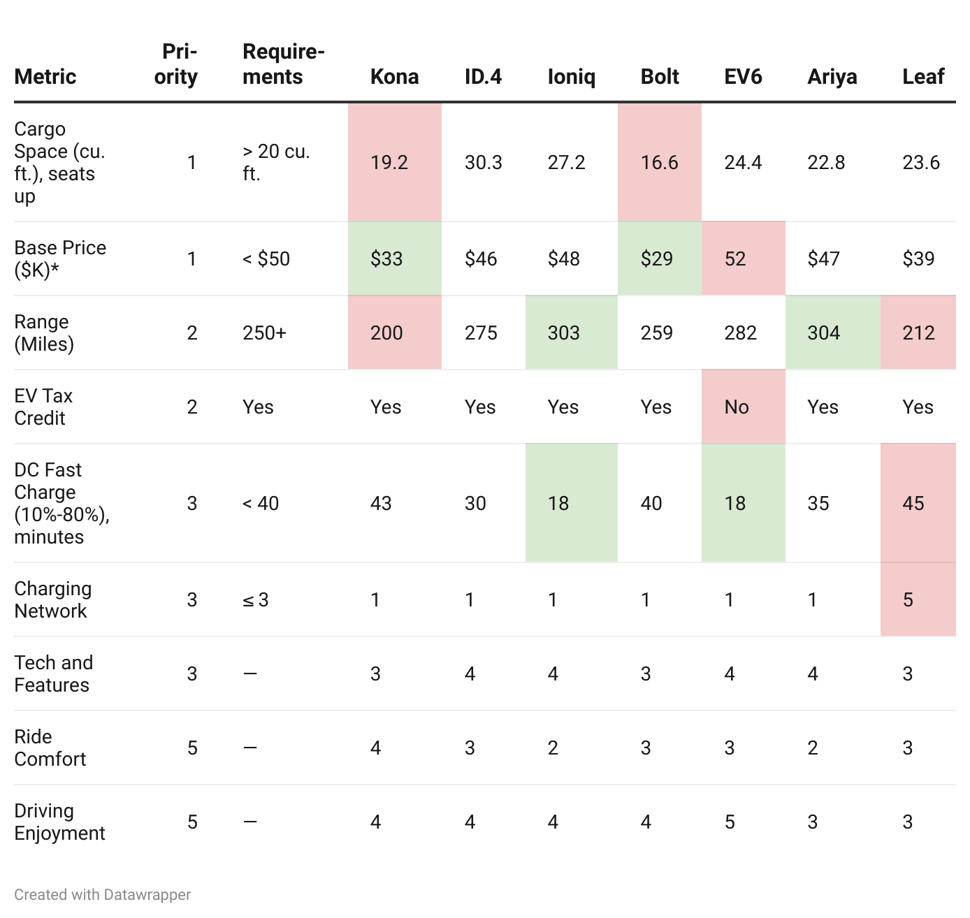 This structured approach makes problematic options immediately apparent. The Kona and Leaf, for instance, fail the hockey bag constraint. The EV6 fails the tax requirement, although that constraint could be folded into an “effective” purchase price. In any case, the EV6 is already the most expensive, so the tax constraint is irrelevant.