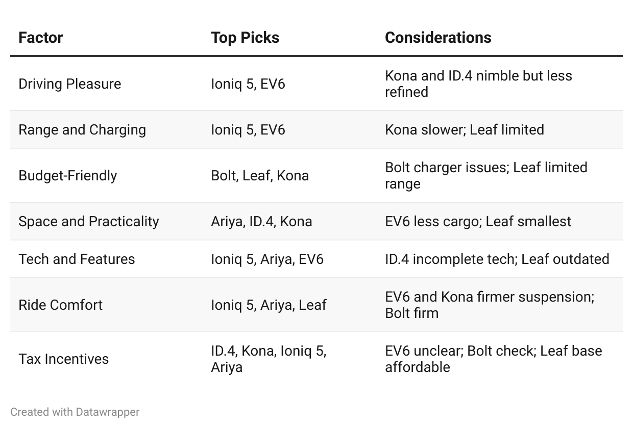 The options are non-luxury electric vehicles that are readily available in the United States: Kona SEL, ID.4 Pro, Ioniq 5 SEL, Bolt 2LT, EV6 Wind AWD, Nissan Ariya Venture+, and Leaf SV+.